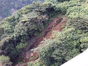 上からコンクリート床版を見た状況。前面が洗堀を受けている。ブロックや張石でないので追従性が無いのだろう。 |